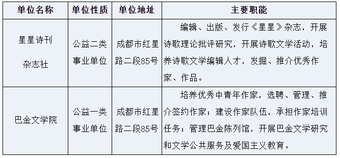 》等有关规定,四川省作家协会(以下简称省作协)拟面向社会公开招聘部分工作人员补充到星星诗刊杂志社和巴金文学院2个直属事业单位工作。现将公开招聘有关事项公告如下。(本公告由省作协同时在