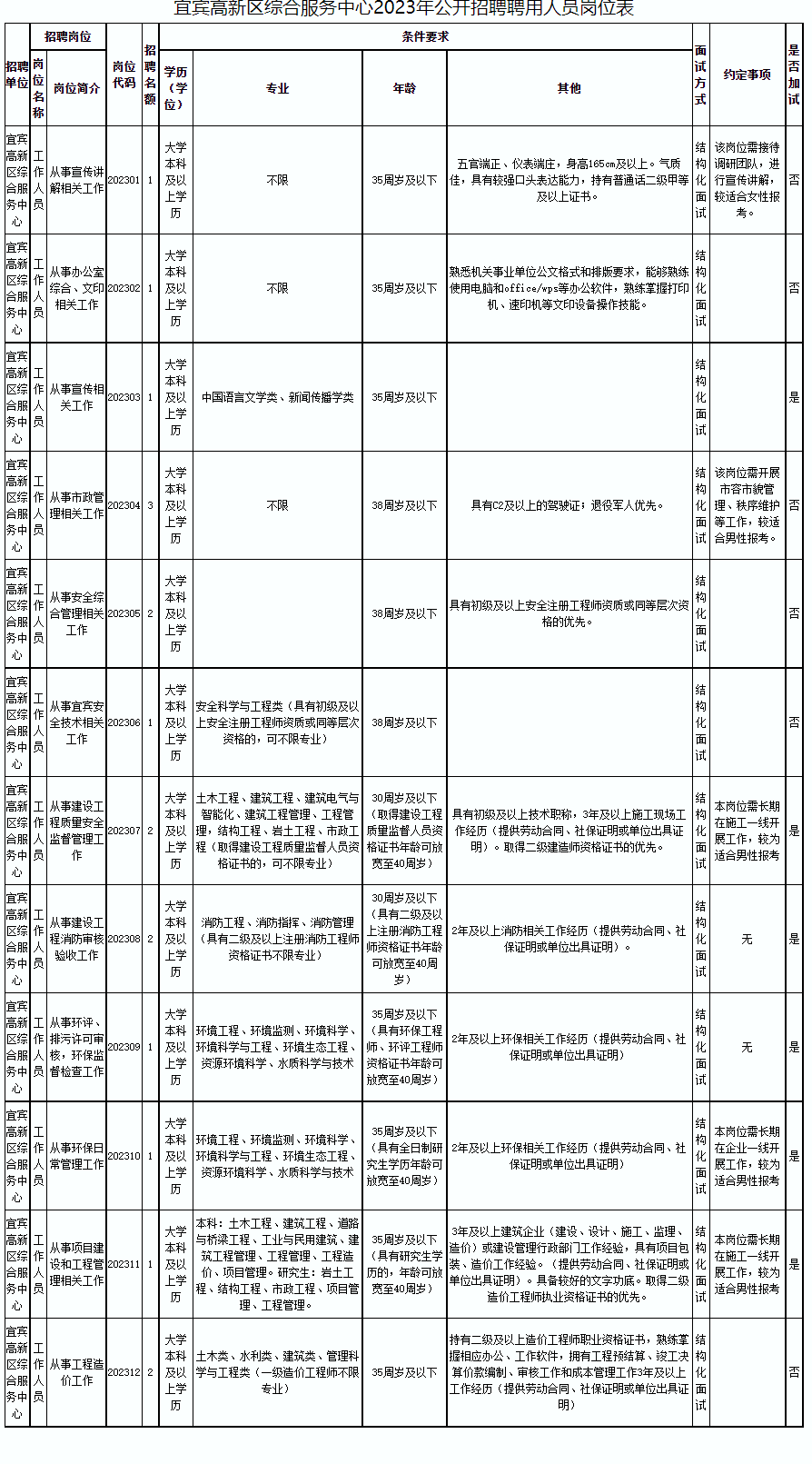 招聘聘用人员18名,岗位具体情况详见本公告附件1《宜宾高新区综合服务中心2023年公开招聘聘用人员岗位表》。