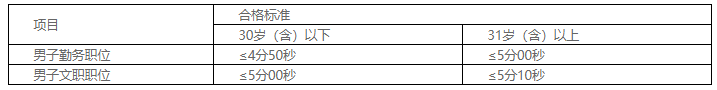 体能测试项目为1000米跑,体能测试合格标准见下表,测评次数只有1次。